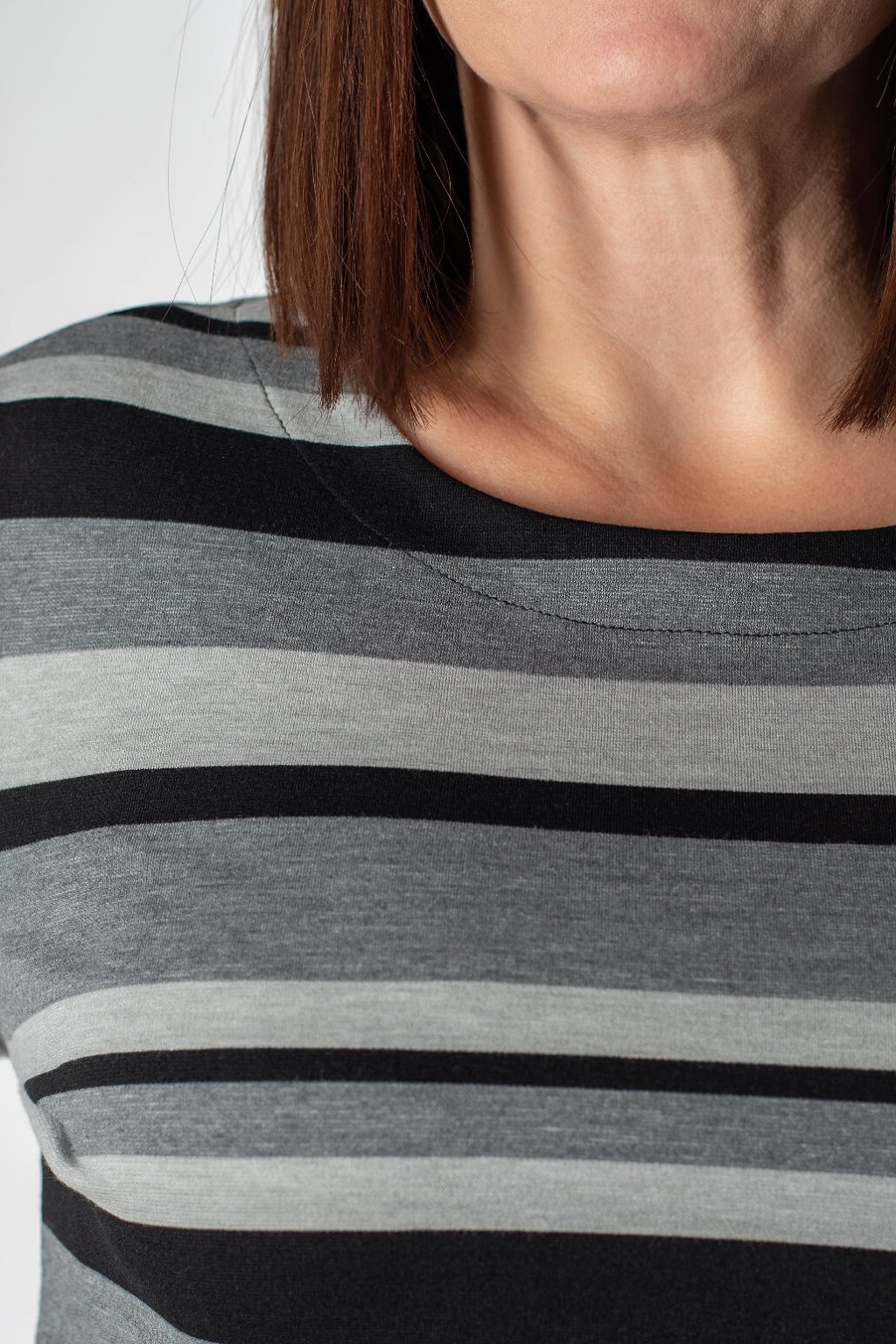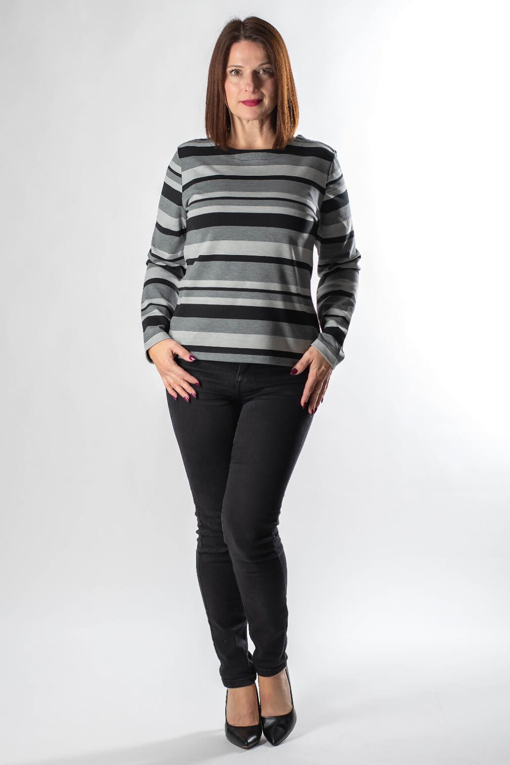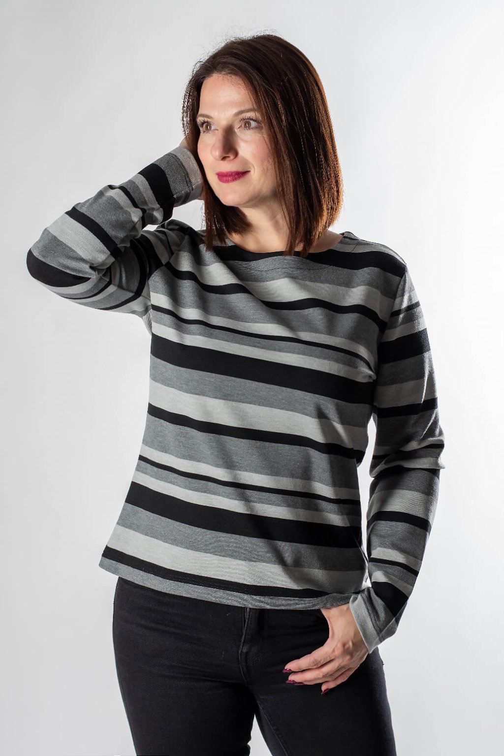 Triko PRULA je definicí nekomplikovaného stylu a pohodlí. Tento model s dlouhým rukávem a horizontálními pruhy v elegantních odstínech černé, tmavě šedé a světle šedé barvy, představuje ideální základ pro váš každodenní outfit. Jeho mělký výstřih jemně podtrhuje ženskost a volnější, rovný střih zaručuje, že se budete cítit komfortně od rána do večera.Ideální pro kombinování s tmavými džínami.