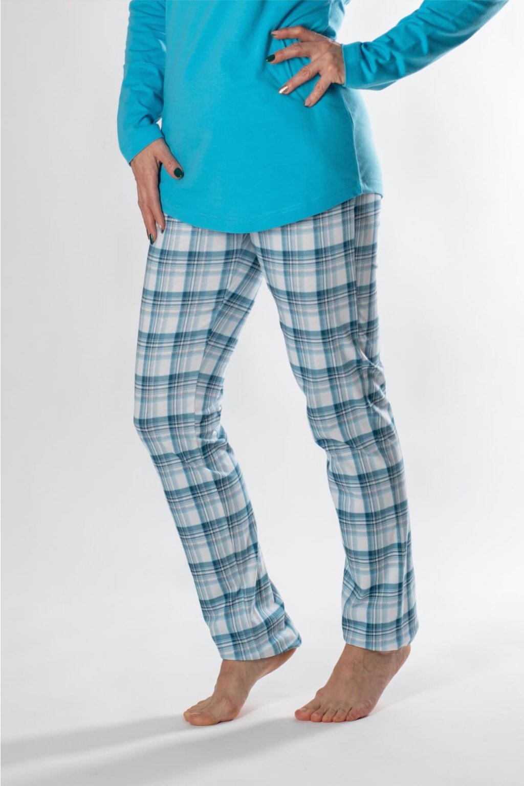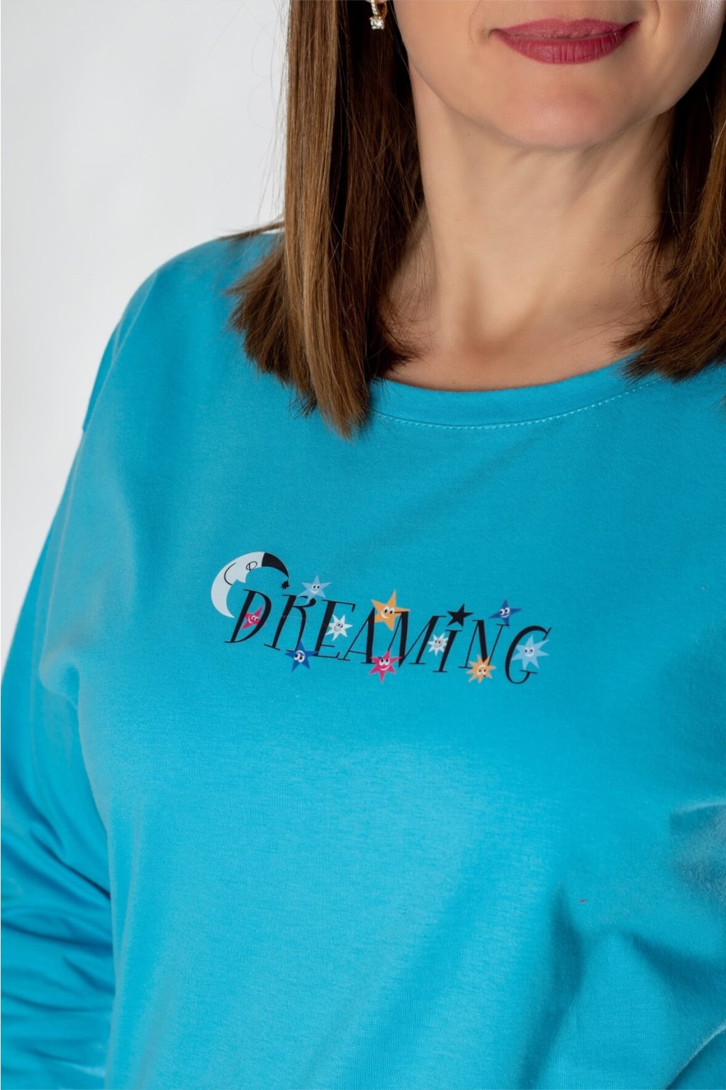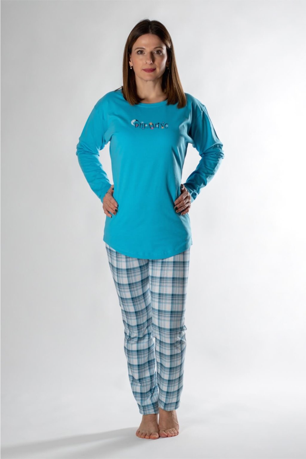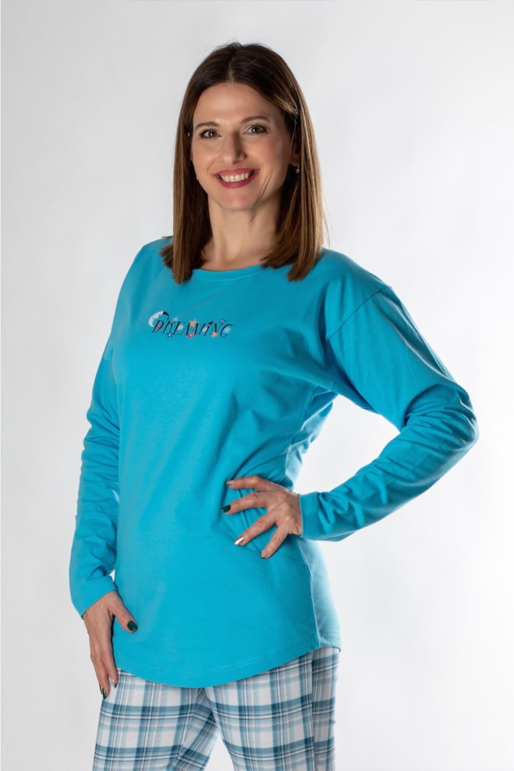Dámské pyžamo pohodlného střihu s padlým pohodlným rukávem. Jednobarevné tričko pyžama má dlouhý rukáv a na předním díle potisk.