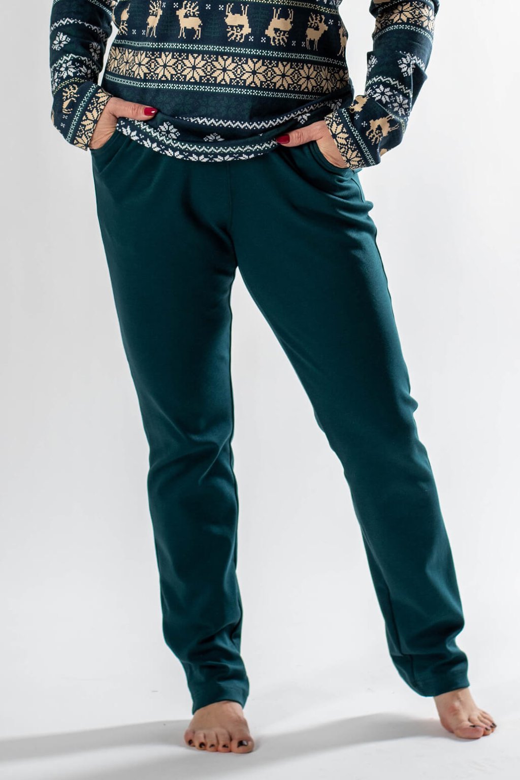 Pyžamo je navrženo s dlouhým rukávem a dlouhými kalhotami, což zaručuje teplo a pohodlí během celého roku. Triko má klasický, pohodlný kulatý výstřih.Spodní díl tvoří jednobarevné kalhoty ve smaragdově zeleném odstínu, které působí elegantně.