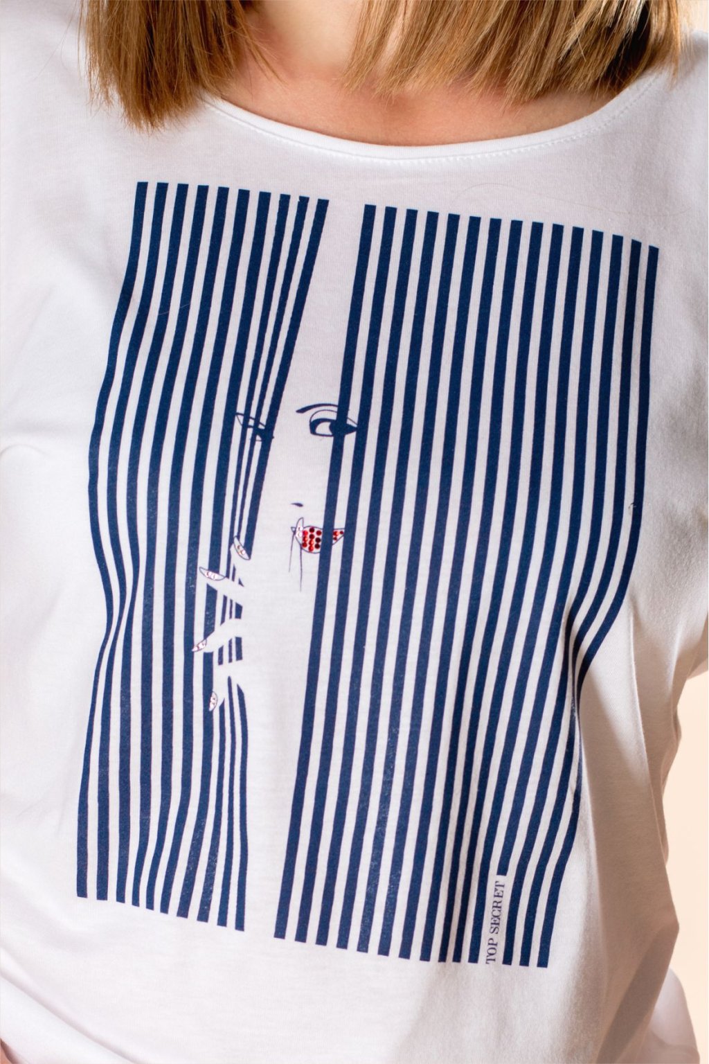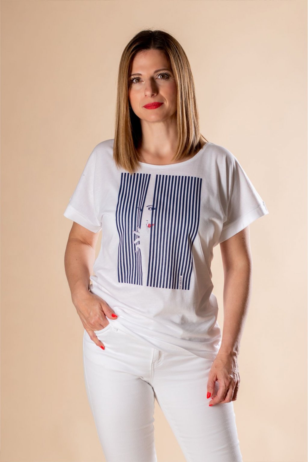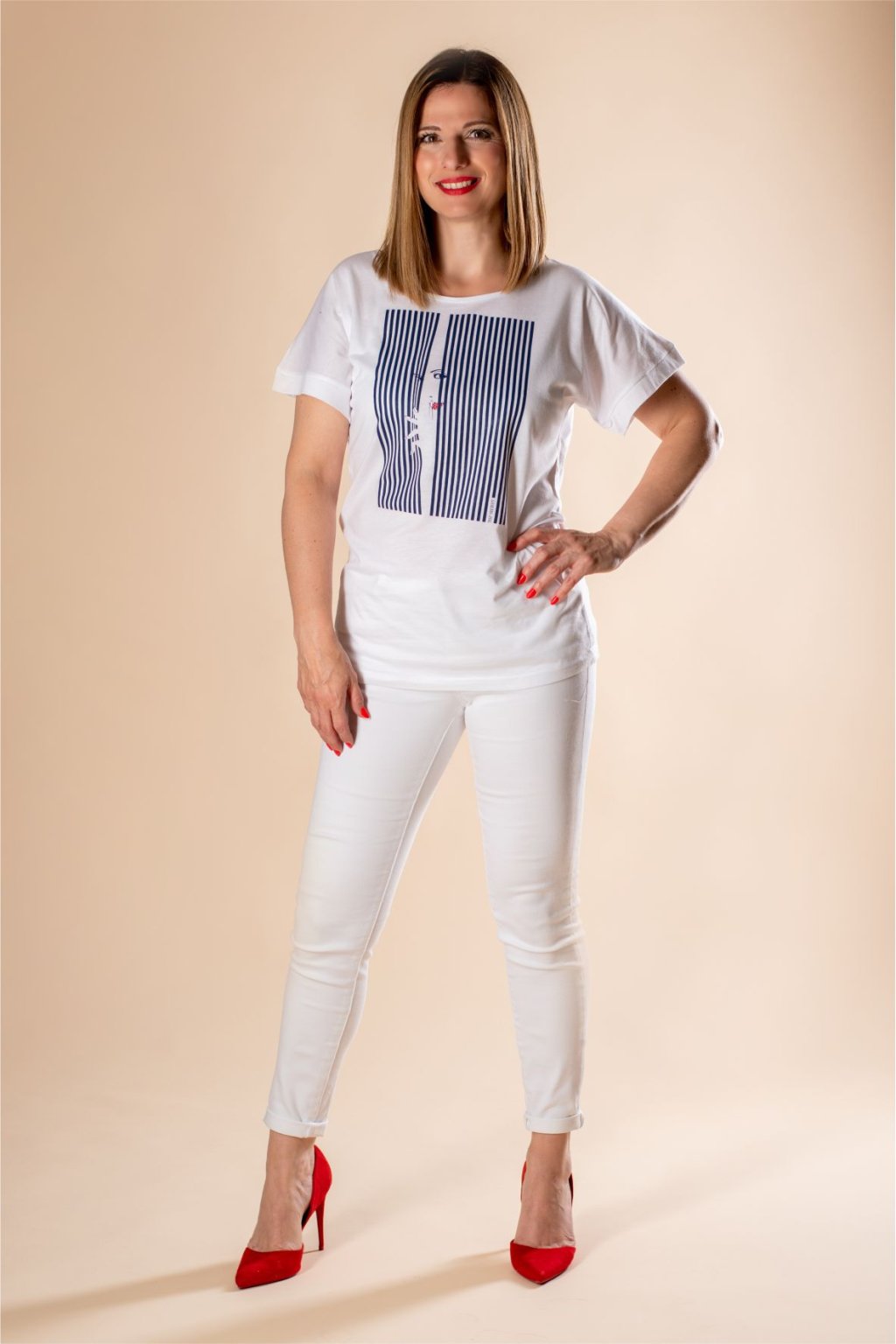 Bílé triko v oblíbeném jednoduchém střihu. Triko má volný padlý rukáv, ve kterém se budete cítit velmi pohodlně. Potisk dotváří křišťály Swarovski. Je vhodné pro každodenní příležitost. Hodí se k sukni nebo ke kalhotám z naší nabídky.