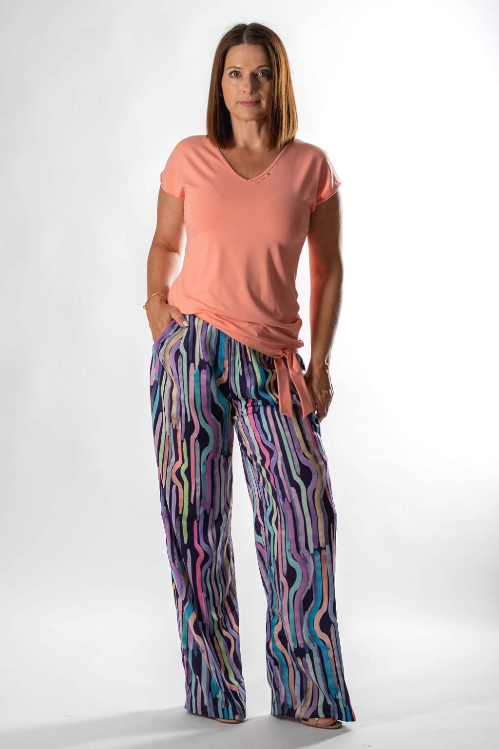 Toto pohodlné tričko z viskózy a elastanu má volnější střih s padlými rukávy a s V výstřihem, což jej činí ideálním i pro plnější postavy nebo pro dny, kdy hledáte maximální pohodlí. Kolem výstřihu jsou kamínky swarovski. Vázačka v dolní části trička umožňuje přizpůsobení. Zkombinujte jej s kalhotami z naší nabídky a vytvořte si stylový a pohodlný outfit.