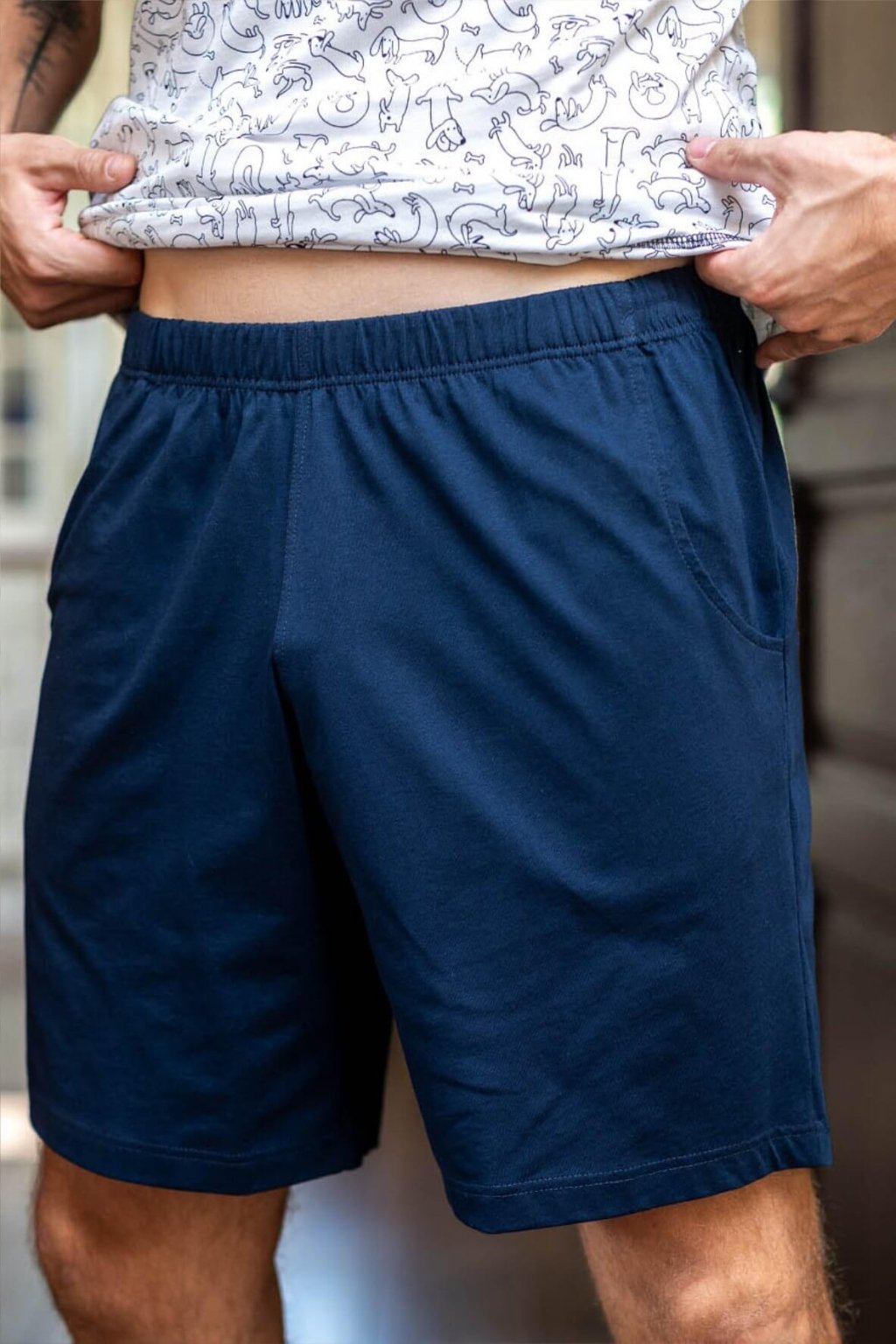 Krátké tmavomodré kalhoty s kapsami jsou volné a v pase na gumu.