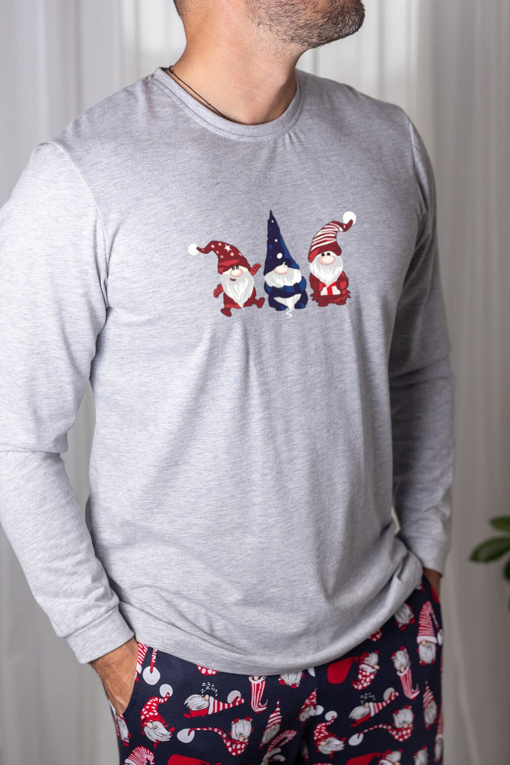 Pohodlné pánské pyžamo s dlouhým rukávem. Horní díl světle šedý s barevným potiskem skřítků, spodní díl s celoplošným motivem. Měkké, hřejivé a ideální pro vánoční rána.