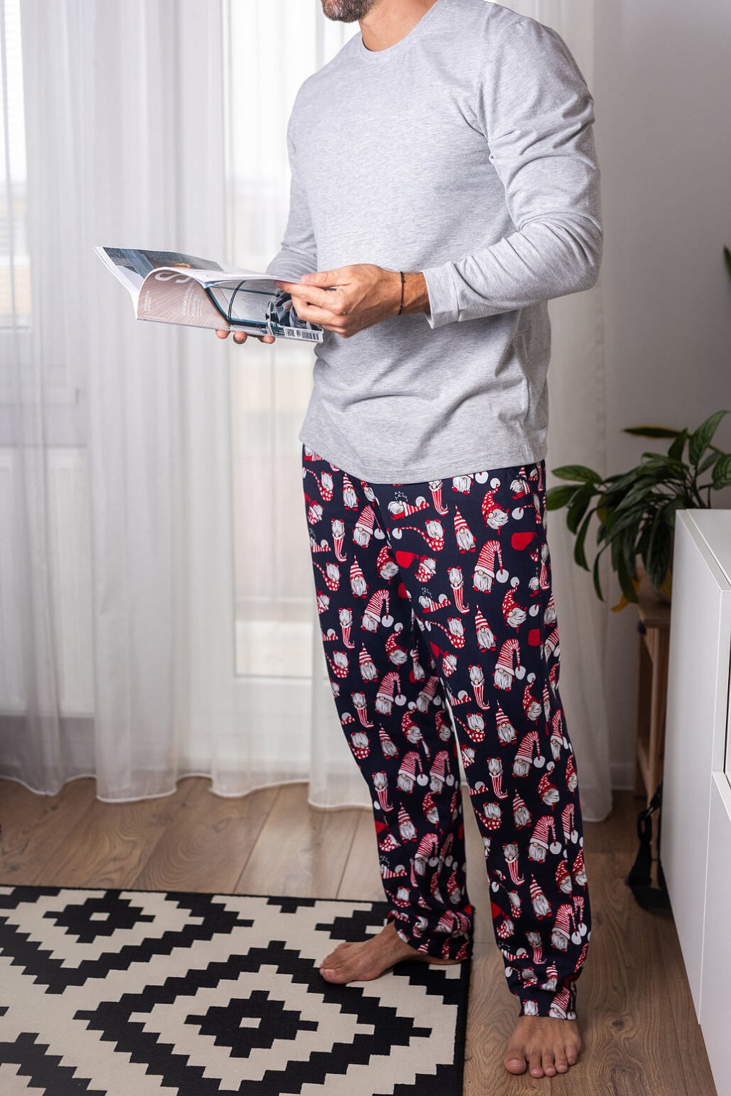 Pohodlné pánské pyžamo s dlouhým rukávem. Horní díl světle šedý bez potisku , spodní díl s celoplošným motivem. Měkké, hřejivé a ideální pro vánoční rána.