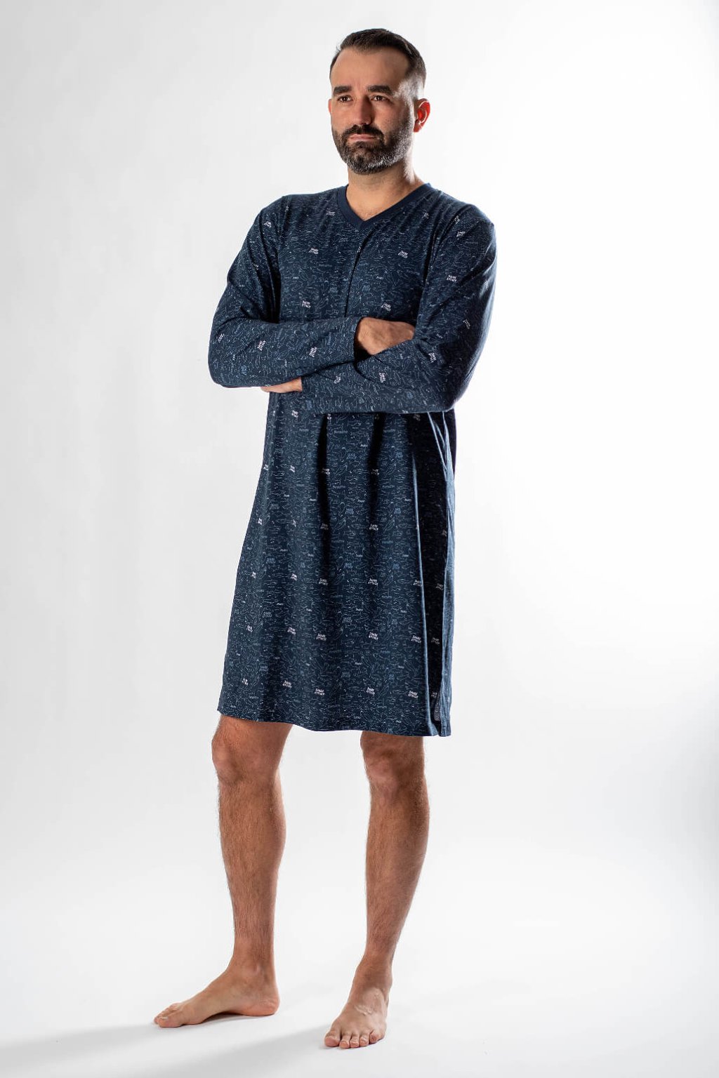 Tento tradiční, ale stále oblíbenější kousek, je ideální pro muže, kteří oceňují volnost a teplo během chladných nocí.Noční košile je střižena pro maximální volnost pohybu a neomezuje během spánku. Je ideální volbou pro hluboký a ničím nerušený odpočinek. Model s dlouhým rukávem a délkou do poloviny stehen zaručuje, že vám nebude zima ani v chladnějších měsících. Vyrobená z měkkého a prodyšného materiálu , který je šetrný k pokožce a poskytuje pohodlí. Noční košile v tmavě modré barvě s decentním, jemným celoplošným potiskem působí elegantně a mužně. Výstřih ve tvaru V.