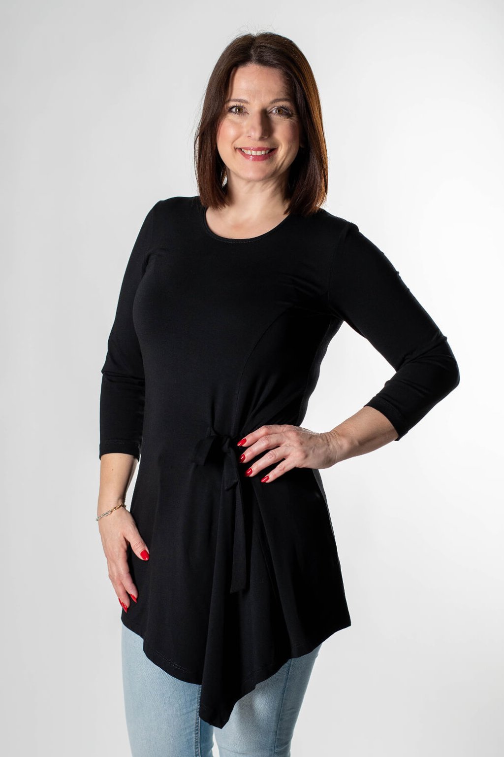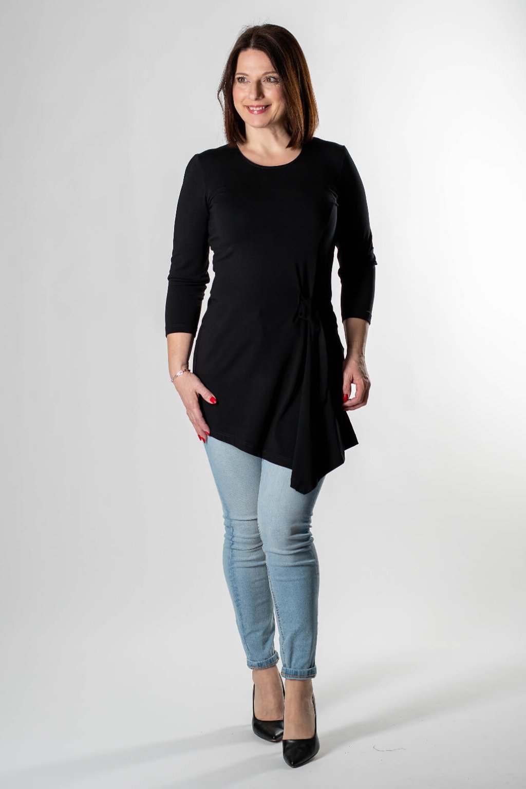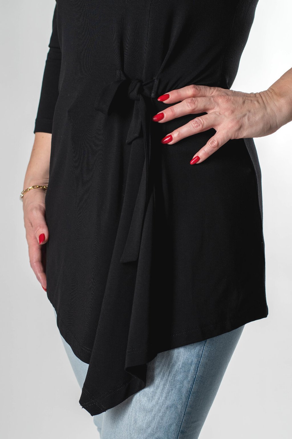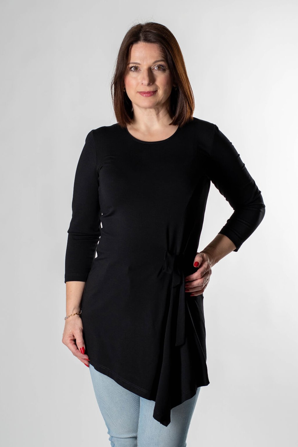 Dopřejte si kousek, který lichotí postavě a zároveň se v něm budete cítit mimořádně pohodlně. Dámská tunika PORTANA v klasické černé barvě je navržena pro ženy, které hledají univerzální oděv do práce i pro volný čas. Dominantním prvkem je asymetrický střih s efektním vázáním na boku, které zvýrazňuje pas a dodává modelu moderní šmrnc.