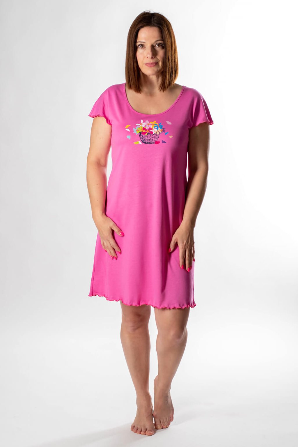 Tato noční košile je ideální volbou pro ženy, které hledají maximální komfort a styl i během spánku nebo odpočinku. Noční košile je vyrobena z příjemné směsi bavlny a modalu, která zaručuje vyjímečnou měkkost, prodyšnost a jemnost na dotek. Díky tomu se budete cítit mimořádně příjemně a pohodlně po celou noc. Má výrazný potisk květin v košíku a volnější střih s padlým rukávem, což poskytuje dostatek prostoru a volnost pohybu. Spodní část košile je mírně rozšířená, což dodává designu lehkost a ležérnost. Délka košile je po kolena.Speciálním detailem, který podtrhuje její šarm, je spodek košile a rukávů, které mají vlnící se efekt. Je ideální pro relax po dlouhém dni nebo jako pohodlný domácí outfit k lenošení, ale obzvláště pro nejpříjemnější spánek. S touto bramboříkovou noční košilí si užijete každý moment odpočinku naplno.