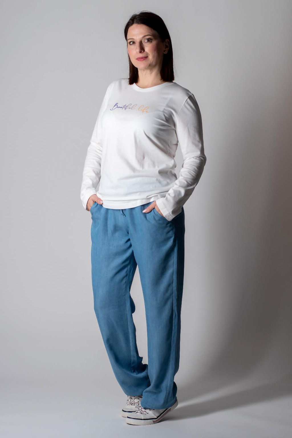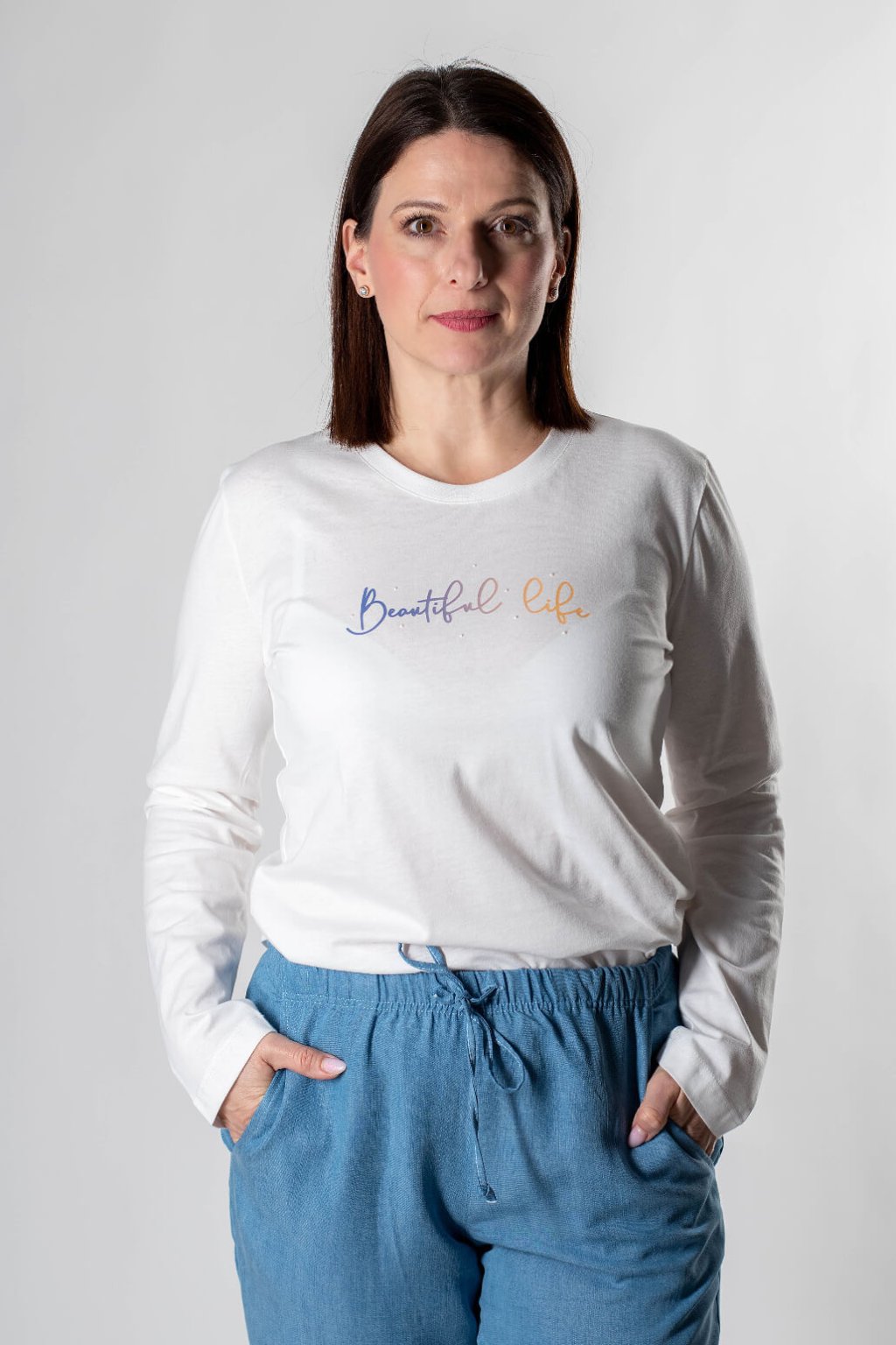 Dopřejte si pohodlí a styl s tímto dámským tričkem máslové barvy. Je vyrobeno ze 100% bavlny, díky čemuž je měkké na dotek a výborně prodyšné. Jednoduchý, ležérní střih s dlouhými rukávy a kulatým výstřihem zaručuje komfortní nošení po celý den. Triko zdobí jemný nápis Beautiful life a drobné perleťové kamínky.