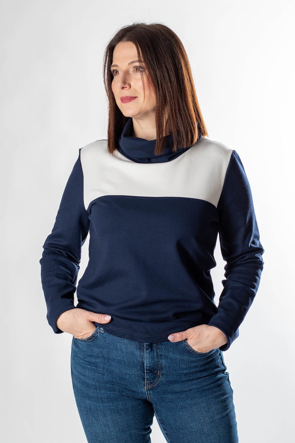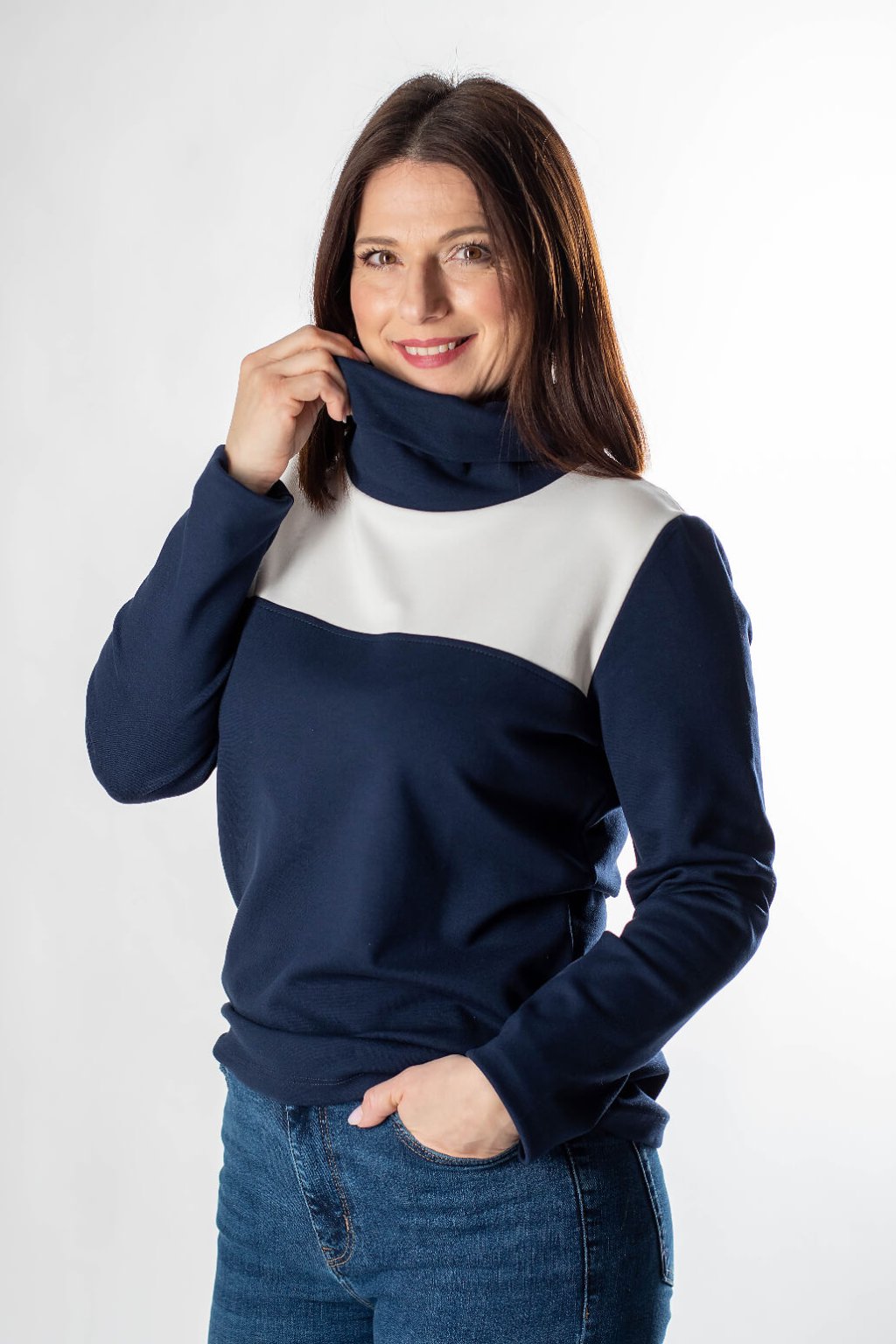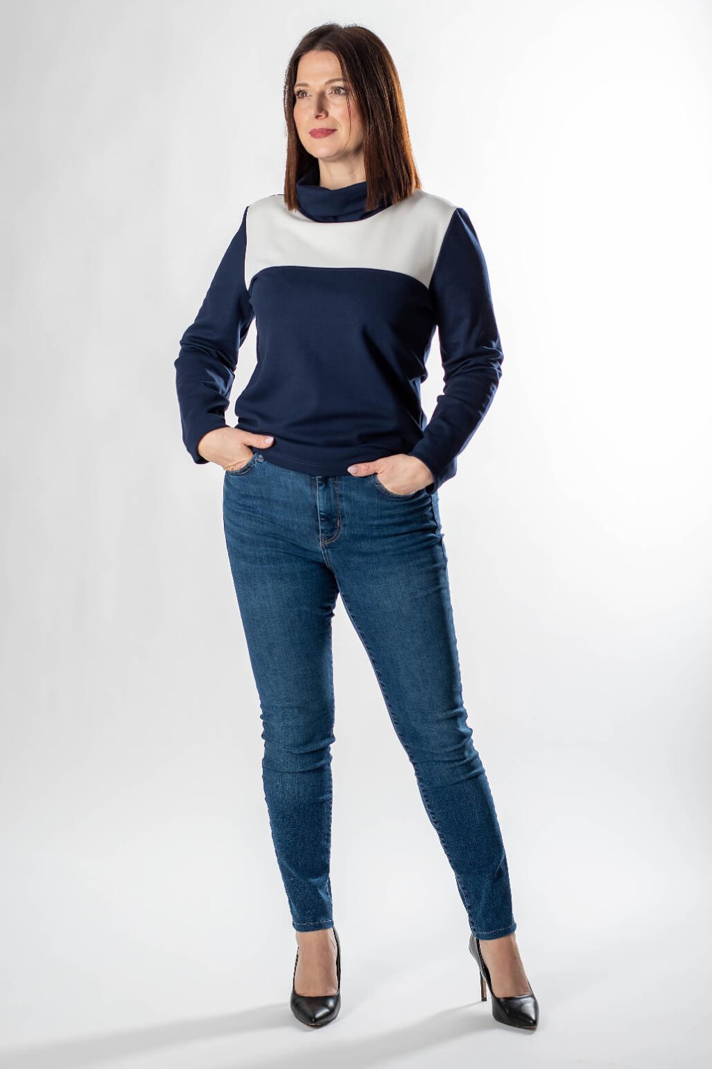Toto triko s dlouhým rukávem je ideální pro ženy, které upřednostňují moderní eleganci a neformální komfort. Kontrastní design s horním dílem a teplou pískovou barvou na spodní části vytváří svěží a šik vzhled. Tričko má volnější, splývavý střih, který lichotí postavě a neomezuje v pohybu. Diskrétní, volný stojáček (nebo jemný roláček) příjemně obepíná krk, poskytuje teplo a dodává outfitu sofistikovaný nádech. Skvělá volba k ležérním džínám, ale ik elegantním kalhotám do práce.