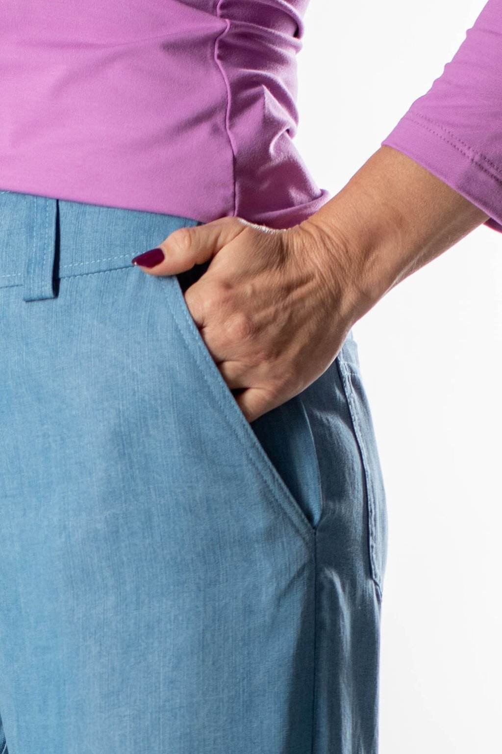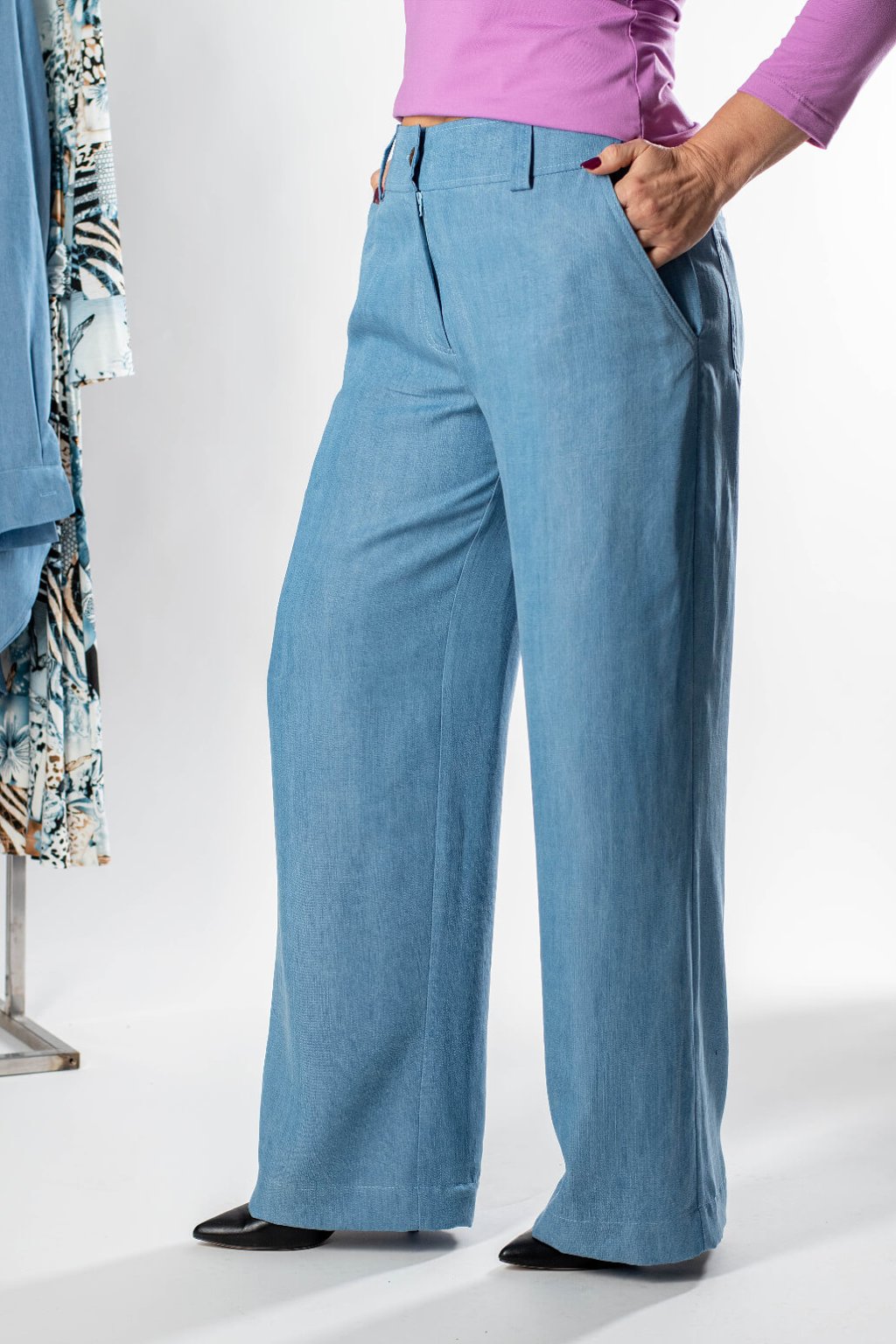 Vysoký pas opticky prodlouží postavu, zatímco volný střih kalhot typu palazzo poskytuje bezkonkurenční svobodu pohybu a vzdušnost. Kalhoty jsou vybaveny praktickými bočními kapsami a zapínáním na zip a knoflík, které dotváří elegantní a zároveň ležérní look.