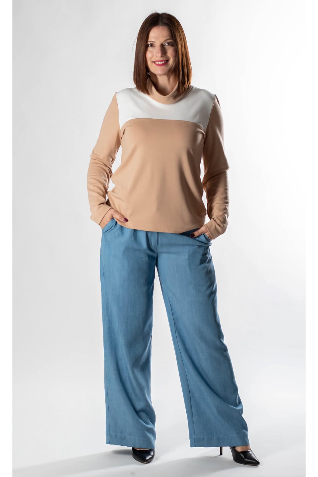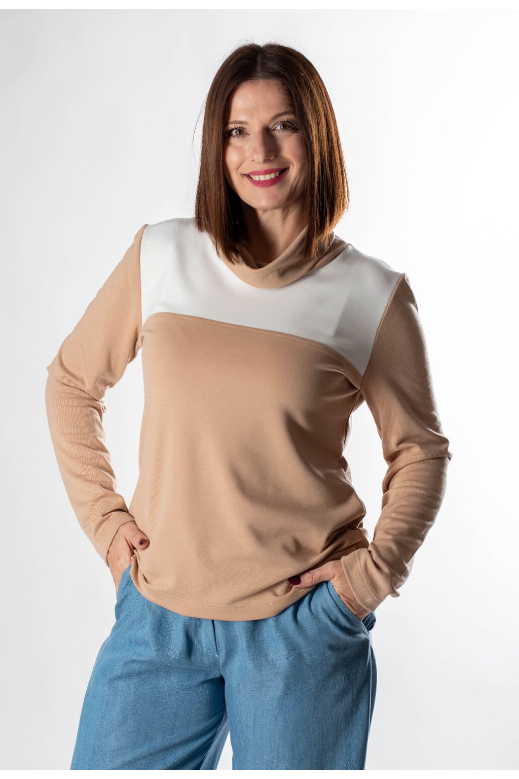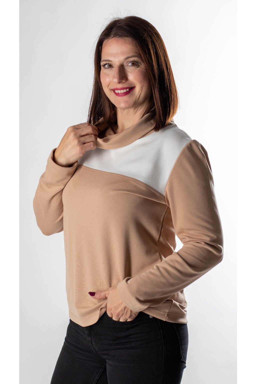 Toto triko s dlouhým rukávem je ideální pro ženy, které upřednostňují moderní eleganci a neformální komfort. Kontrastní design s horním dílem a teplou pískovou barvou na spodní části vytváří svěží a šik vzhled. Tričko má volnější, splývavý střih, který lichotí postavě a neomezuje v pohybu. Diskrétní, volný stojáček (nebo jemný roláček) příjemně obepíná krk, poskytuje teplo a dodává outfitu sofistikovaný nádech. Skvělá volba k ležérním džínám, ale ik elegantním kalhotám do práce.
